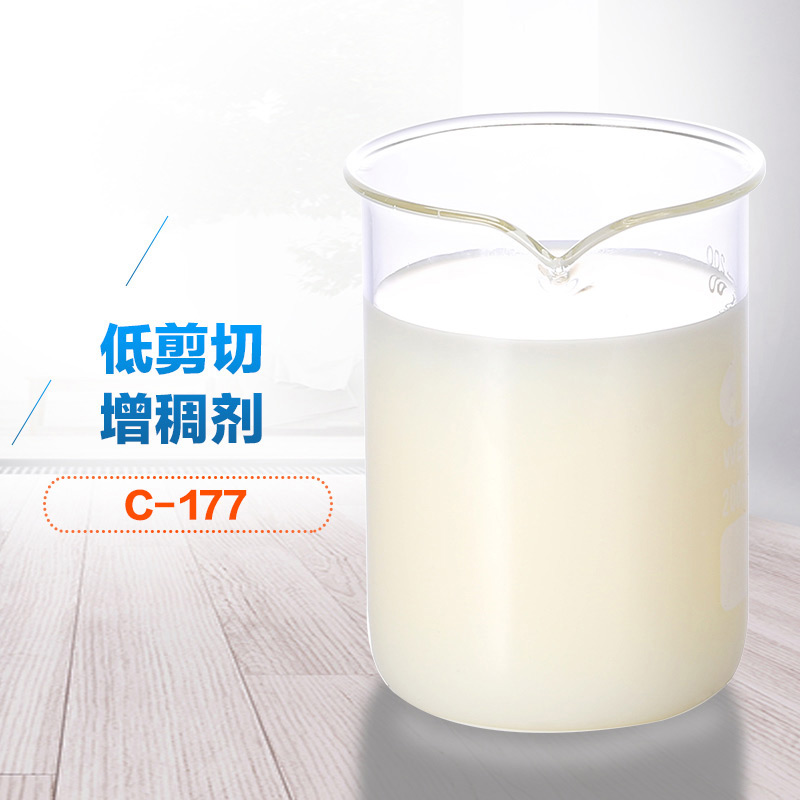低剪切增稠剂是一种通过缔合提供优异的流变触变性能、良好的增稠效率;产品为非离子聚醚改性PU增稠剂,增稠效率几乎不受PH值影响。对水性体系中低剪切粘度效果非常明显,增稠倍率较高,赋予各种体系显著的触变性能。与各种粘结剂相容性能优良。